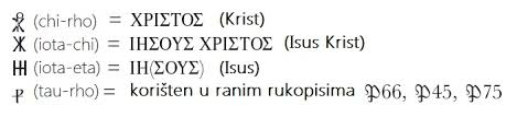 En el Papyrus Bodmer II, una extensa porción de un codex, del Evangelio de Juan, relativamente bien preservada y datada paleográficamente hacia el 200 de la era común, el nombre staurow y las siete formas del verbo staurov están escritas de forma abreviadas y con la Tau y la Rho de estas palabras escritas como un compendio, en cada caso en que la declaración en la que el sustantivo o el verbo aparece, se refiere a la cruz o crucifixión de Jesús.